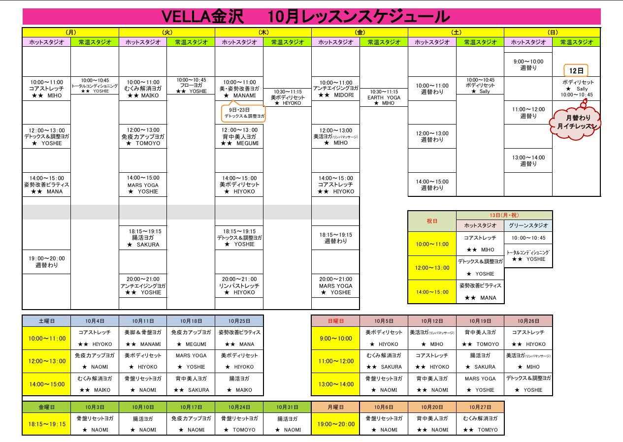 10月のレッスンスケジュール - 金沢スケジュール, 金沢店